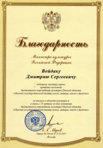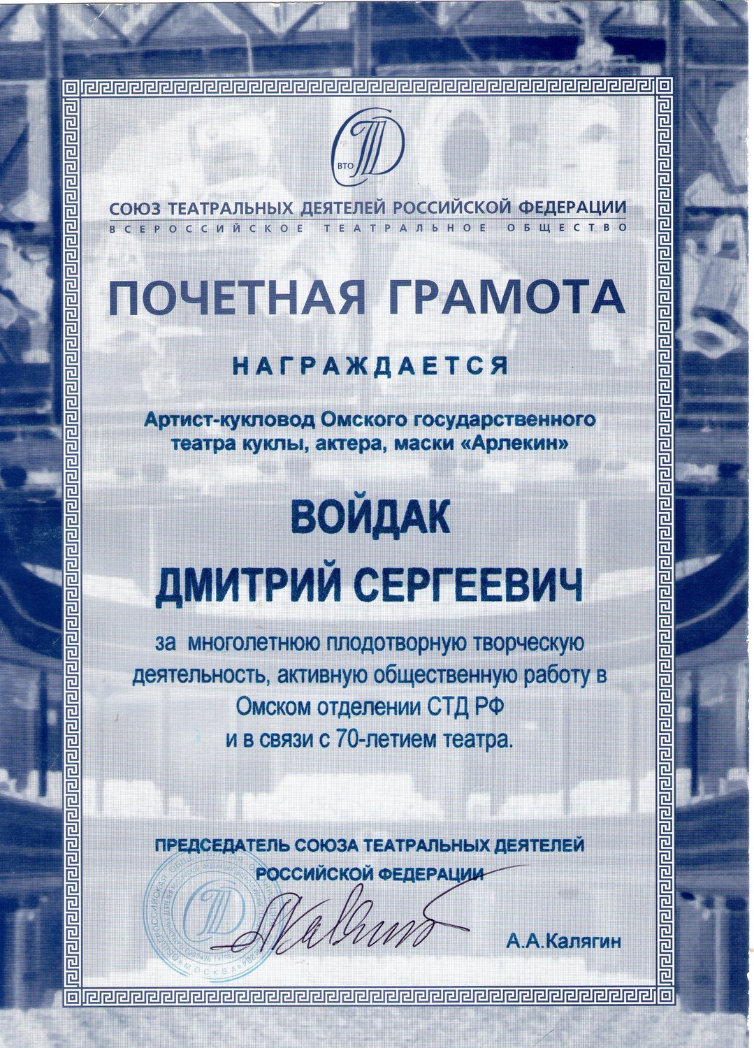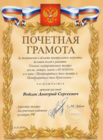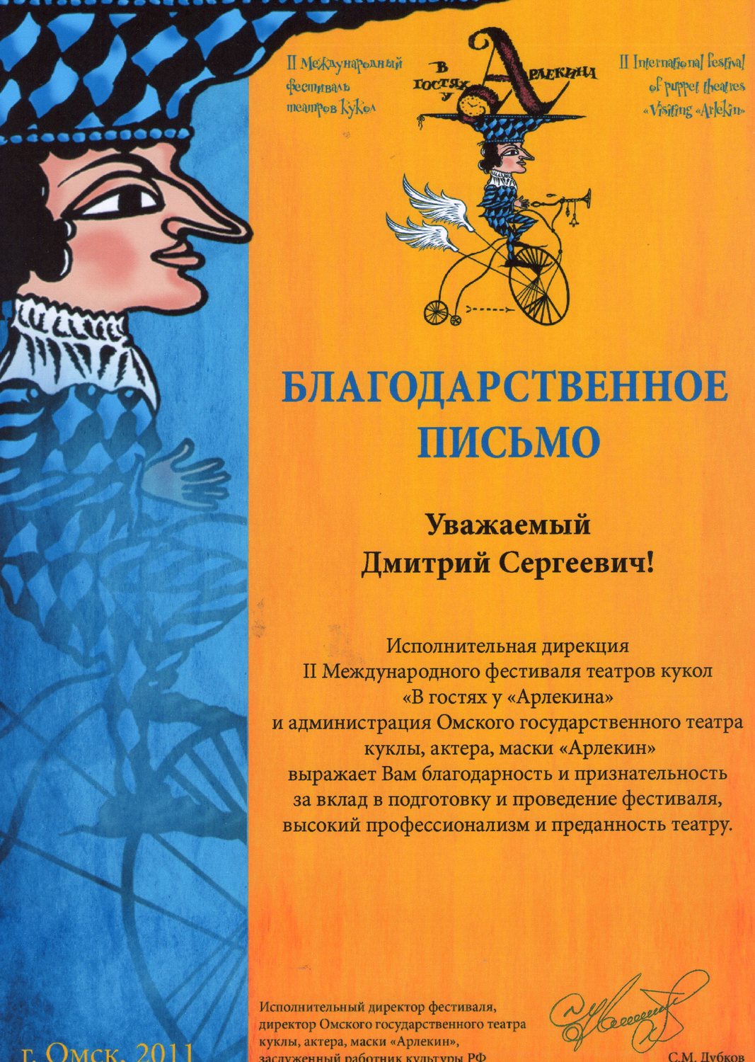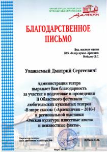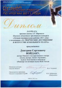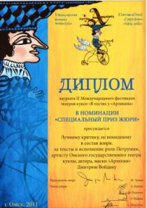 -- "Специальный приз жюри" за "тексты и исполнение роли Петрушки" на II международном фестивале театров кукол "В гостях у "АРЛЕКИНА" г.Омск;