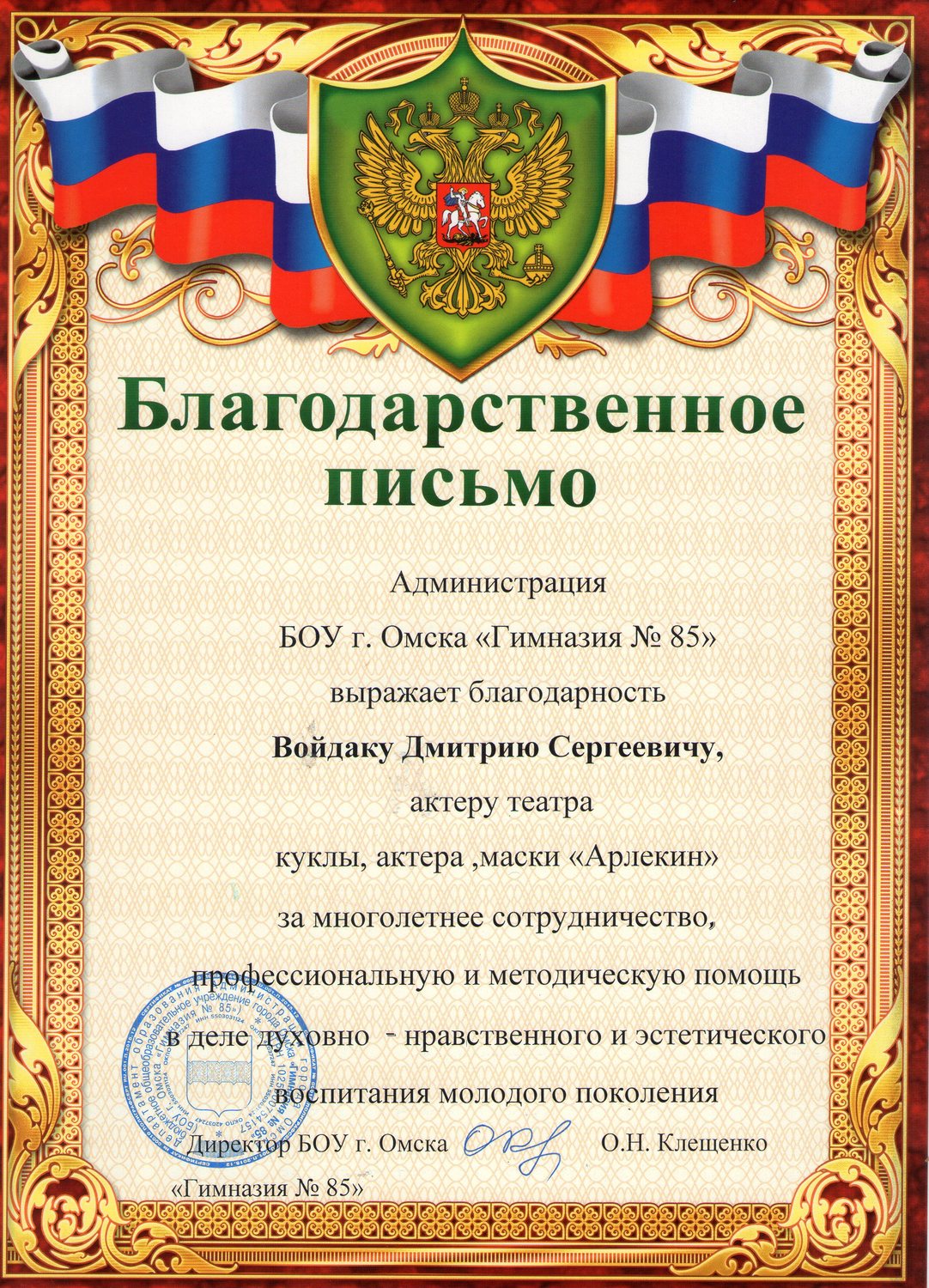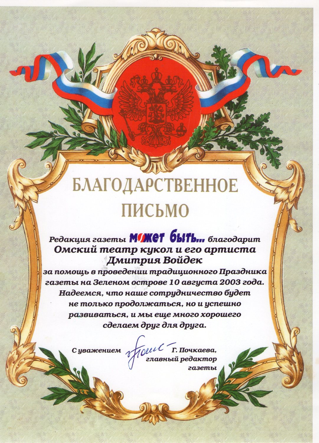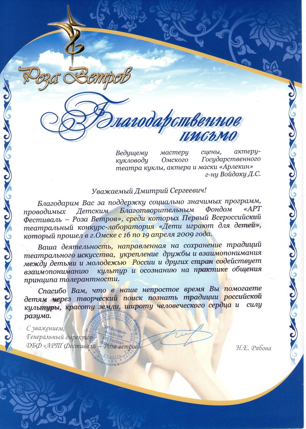 -- "Специальный приз жюри" за "тексты и исполнение роли Петрушки" на II международном фестивале театров кукол "В гостях у "АРЛЕКИНА" г.Омск;