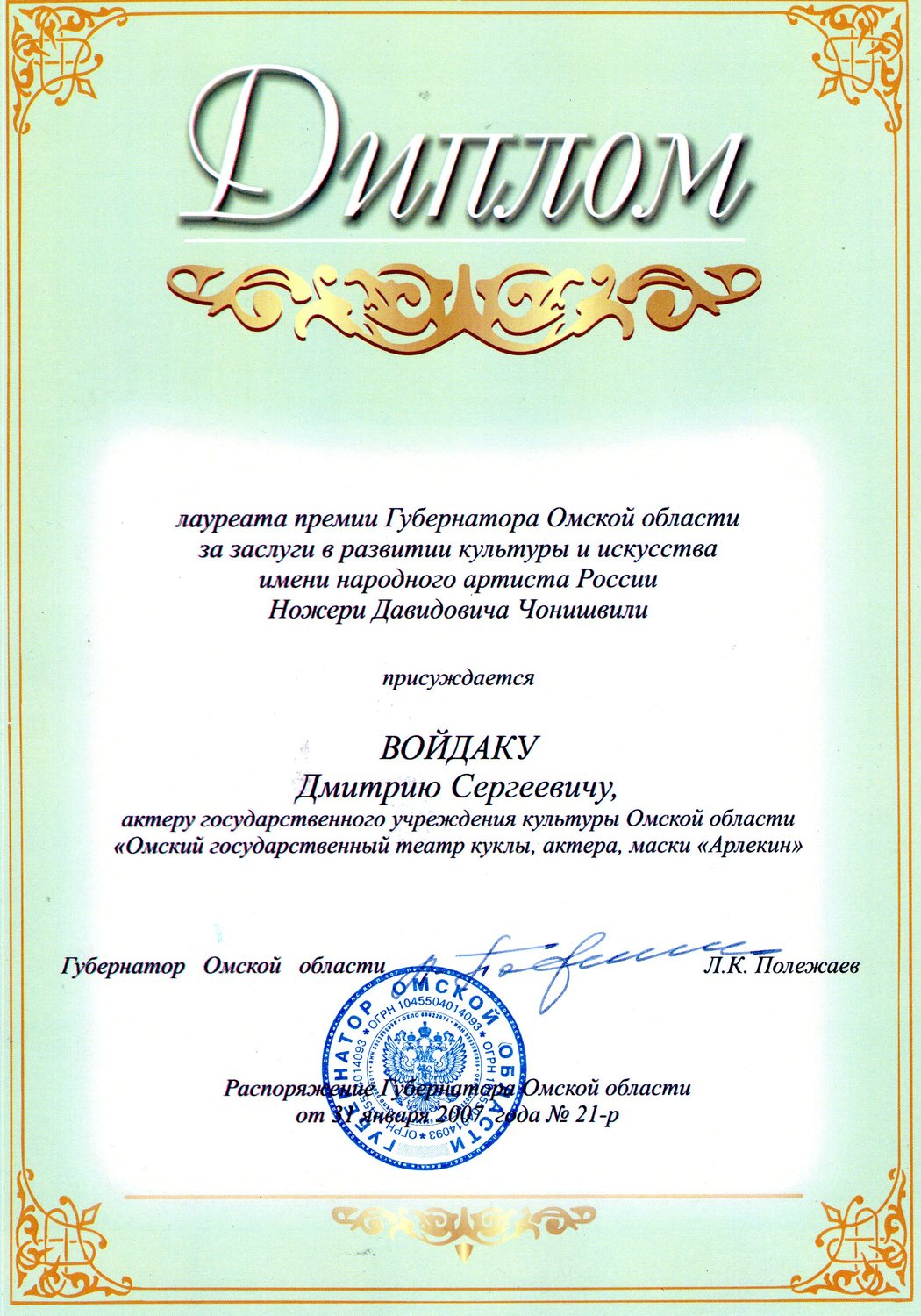 -- Лауреат премии губернатора Омской области "За достижения в области искусства театра кукол";
