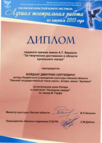 -- Лауреат премии имени А.Т. Варжало в номинации «За творческие достижения в искусстве театра кукол» за роль Петера Мунка в спектакле «Холодное сердце» г. Омск - 2016;