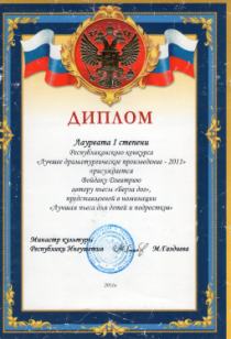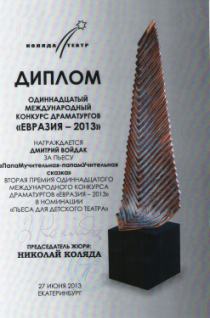 -- Вторая премия международного конкурса драматургов «Евразия - 2013» в номинации «пьеса для детского театра» за пьесу «папаМучительная-папамУчительная сказка»;