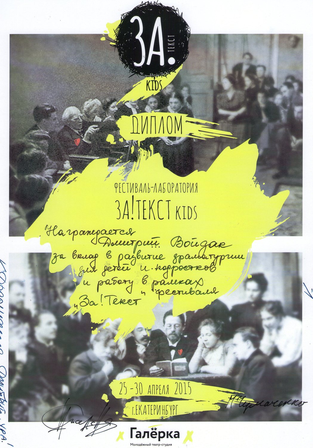 -- Лауреат премии "Лучший детский спектакль" на международном фестивале "Коляда-Plays -2014" за авторский моно спектакль "папаМучительная-папамУчительная сказка".